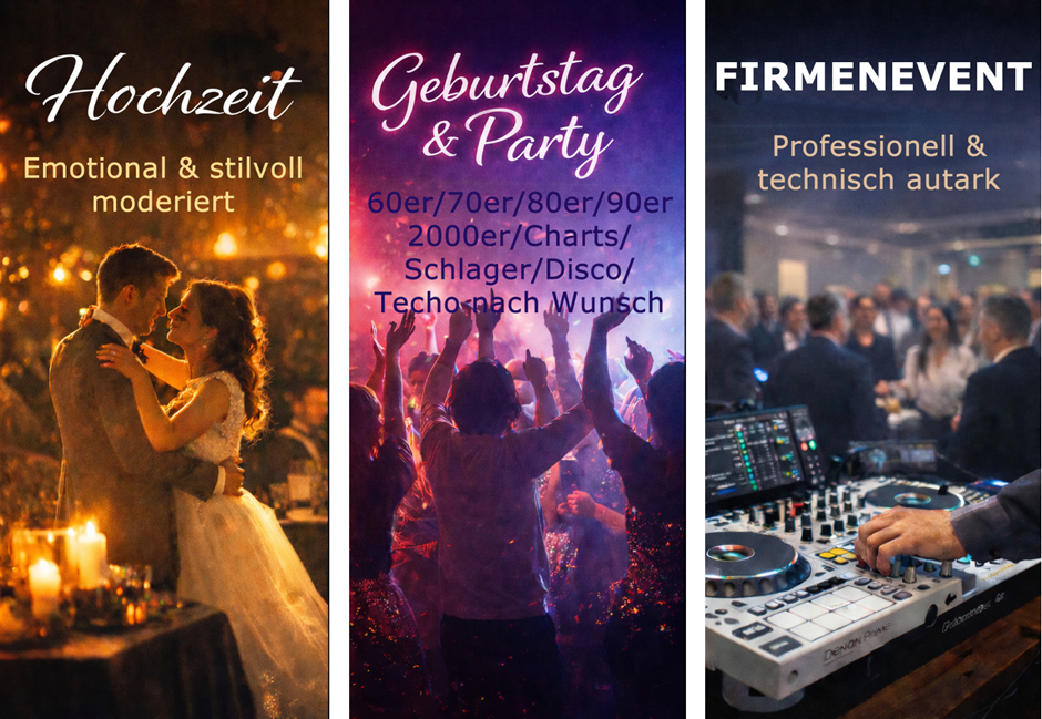 Als mobiler DJ sorge ich für die passende Musik, professionelle Technik und eine volle Tanzfläche – abgestimmt auf Ihr Publikum und Ihre Wünsche.
